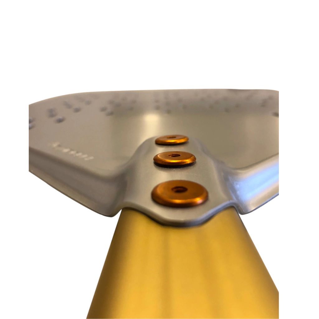 El mango y la pala están unidos con remaches de aluminio color Oro, lo que le da una estética única, además de durabilidad y resistencia a la oxidación.