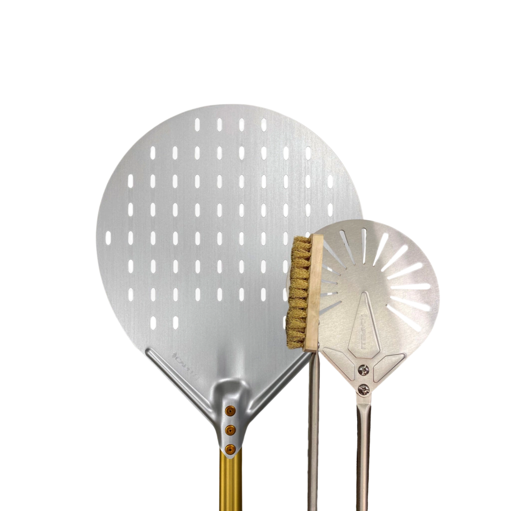 Su forma circular permite un fácil moldeado de la pizza, ayudando a posicionarla con precisión dentro del horno. El matrizado profundo de la pala le otorga una excelente resistencia y rigidez, mientras que las perforaciones eliminan el exceso de harina y reducen el peso de la herramienta.